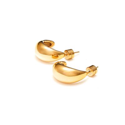Modern elegance with a golden edge. The Dynamic Medium Hoops are crafted from 14k gold-plated stainless steel in a bold dome-shaped silhouette, with a hollowed back for lightweight comfort and a solid rounded butterfly back for a secure, snug fit against the lobe.