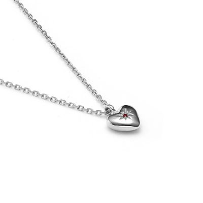 Crafted by artisans in rhodium-plated sterling silver, this necklace features a mini puffed heart pendant centred with a North Star design and a luxurious genuine ruby, a gemstone associated with love, courage, and emotional clarity. Hung from a fine link chain and finished with an extension for easy styling.