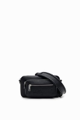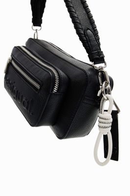 A small crossbody bag in plain leather-effect fabric with an embossed front logo detail and several straps and pockets.