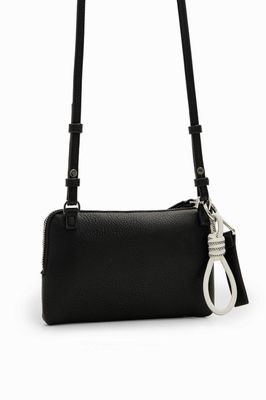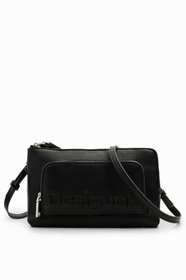A mini bag in plain leather-effect fabric with an embossed front logo detail, a strap, and several compartments and pockets.
