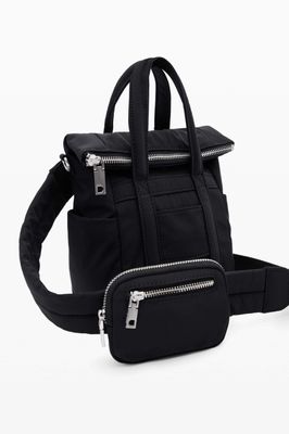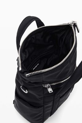 Multi-pocket, multi-position nylon backpack. Removable front pocket and convertible handles.