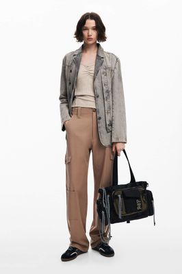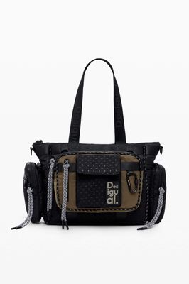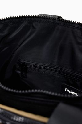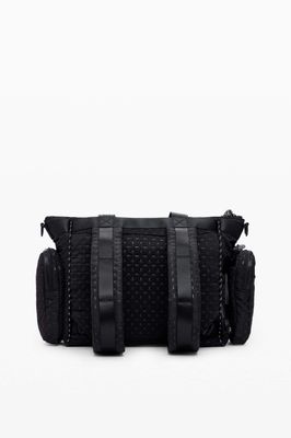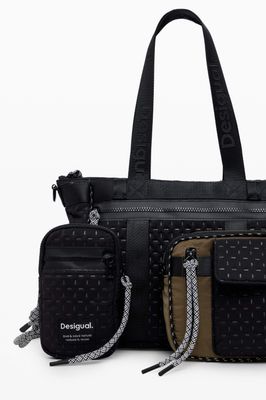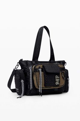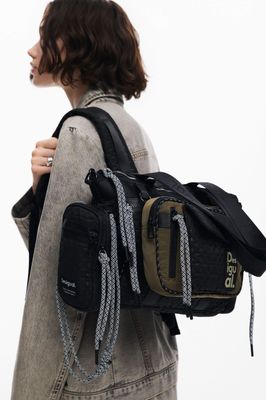 Multiposition nylon handbag with various handles that convert it into a backpack or shoulder bag. Includes detachable purse and mobile phone holder, and multiple pockets.