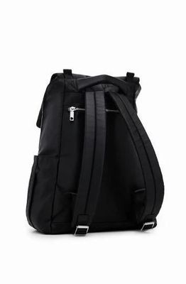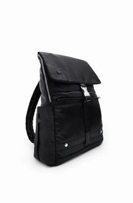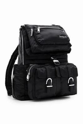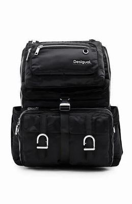 A multi-position nylon backpack with a large capacity and several straps and pockets. The front part includes a detachable crossbody and bum bag.