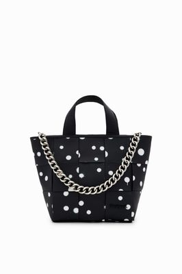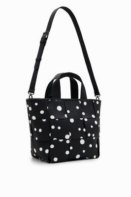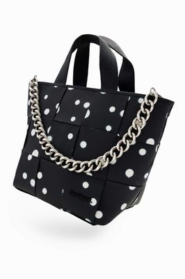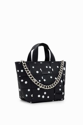 A midsize woven tote bag in textured leather-effect fabric with a droplet print. Featuring several straps and inside pockets.