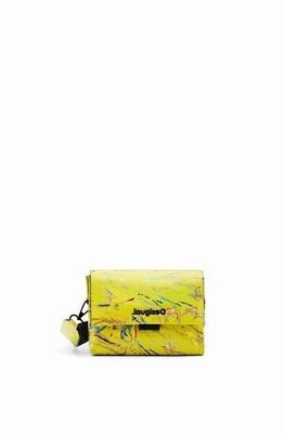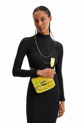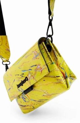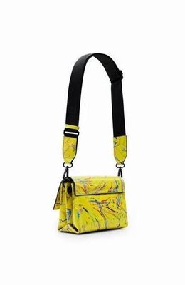 An arty crossbody bag with a craquelure effect in a golden colour and contrasting black straps. Featuring a printed interior with various compartments.