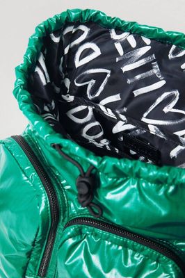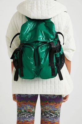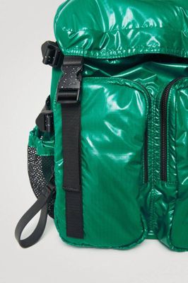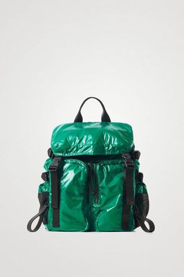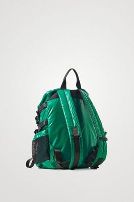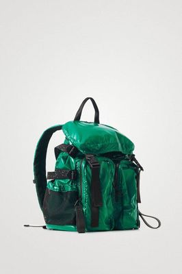 Clip fasteners and zipper with upper flap, four outer pockets, two front cargo type and two side pockets of mesh, inner compartment with large capacity, inner lining with "amore" print, Straps and maxi-pullers, trekking inspiration.