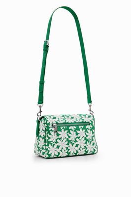 A small bag in textured leather-effect fabric with several straps and pockets.