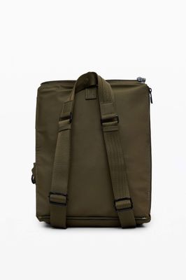 Nylon crossbody bag with denim pocket, featuring various compartments and zippered pockets