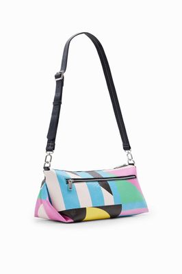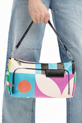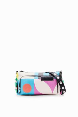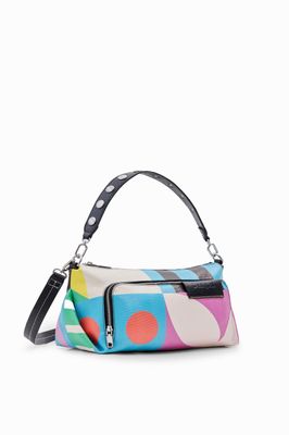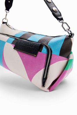 A midsize crossbody bag in leather-effect fabric with a patchwork geometric patch print and several straps, compartments and pockets.