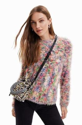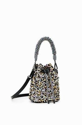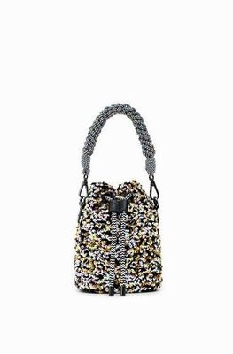 A small bucket bag with a double strap for carrying by hand or across the body made with coloured paillettes. Features a drawstring closure