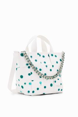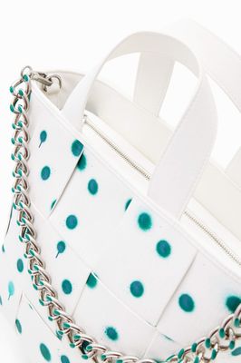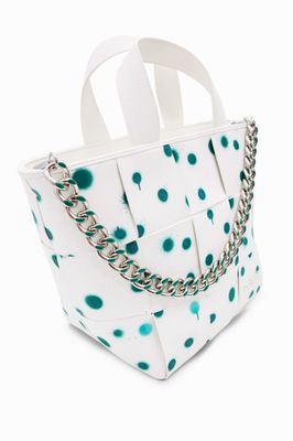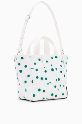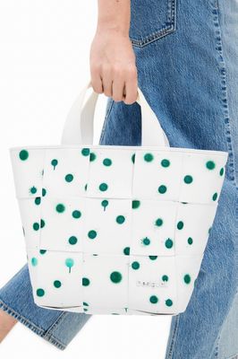 A midsize woven tote bag in textured leather-effect fabric with a droplet print. Featuring several straps and inside pockets.