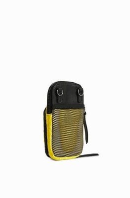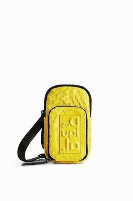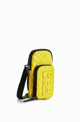 A smartphone pouch with an embossed geometric texture and a large logo on the front. Features multiple pockets and a large fabric strap with logo.