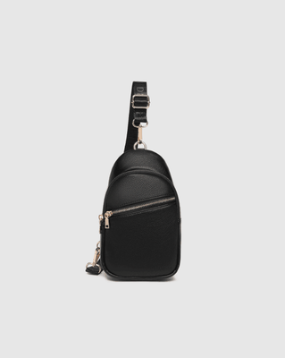 The Baby Bella Black Sling is your go-to light-weight hands-free bag for sightseeing, designed for warm-weather adventures and everyday ease. A petite take on our signature Bella Sling, she offers the same thoughtful functionality in a more compact silhouette - perfect for days that call for less fuss and more freedom. With two spacious compartments and secure zip closures, Baby Bella Black keeps your essentials close while keeping your look polished. Her adjustable and detachable sateen webbing strap is slimmer for all-day comfort and versatility, whether worn across the body or over one shoulder. Finished with light gold hardware and smooth vegan leather, she's a travel crossbody bag that blends style with practicality. From airport terminals to cobblestone streets, Baby Bella Black is made to move with you - bringing elevated minimalism to your everyday adventures.