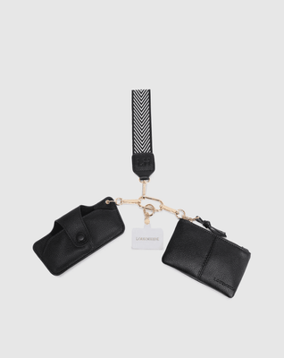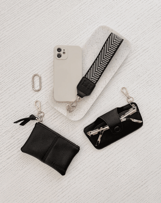 The Ziggy Black Accessory Bundle is the ultimate compact essentials kit for handbags, thoughtfully designed to keep your daily routine effortlessly organised. This curated set combines four functional accessories into one stylish bundle - secured with a Caribou clip to keep everything neatly in place. Inside, you'll find the Skittle Sunglass Case, crafted from soft vegan leather with a plush suede lining and finished with a keyring clasp to attach easily to your bag or keys. The Lenny Purse is travel friendly with RFID blocking and features a slim, compact silhouette that's perfect for storing coins, cards, or small essentials. The bundle also includes a sleek Iris Wristlet for hands-free ease, and a plastic phone converter clip to keep your tech adaptable on the go. Whether you're running errands, heading to brunch, or packing light for a weekend getaway, the Ziggy Black Accessory Bundle offers everything you need in one travel-friendly kit.