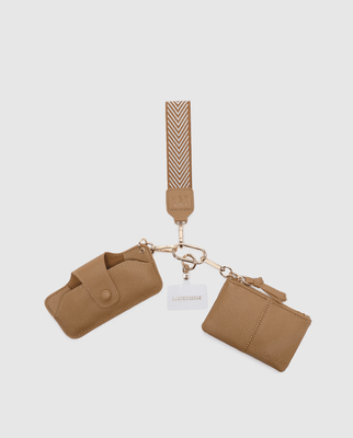 The Ziggy Camel Accessory Bundle is the ultimate compact essentials kit for handbags, thoughtfully designed to keep your daily routine effortlessly organised. This curated set combines four functional accessories into one stylish bundle - secured with a Caribou clip to keep everything neatly in place. Inside, you'll find the Skittle Sunglass Case, crafted from soft vegan leather with a plush suede lining and finished with a keyring clasp to attach easily to your bag or keys. The Lenny Purse is travel friendly with RFID blocking and features a slim, compact silhouette that's perfect for storing coins, cards, or small essentials. The bundle also includes a sleek Iris Wristlet for hands-free ease, and a plastic phone converter clip to keep your tech adaptable on the go. Whether you're running errands, heading to brunch, or packing light for a weekend getaway, the Ziggy Camel Accessory Bundle offers everything you need in one travel-friendly kit.