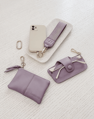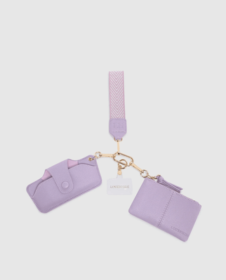 The Ziggy Lilac Accessory Bundle is the ultimate compact essentials kit for handbags, thoughtfully designed to keep your daily routine effortlessly organised. This curated set combines four functional accessories into one stylish bundle - secured with a Caribou clip to keep everything neatly in place. Inside, you'll find the Skittle Sunglass Case, crafted from soft vegan leather with a plush suede lining and finished with a keyring clasp to attach easily to your bag or keys. The Lenny Purse is travel friendly with RFID blocking and features a slim, compact silhouette that's perfect for storing coins, cards, or small essentials. The bundle also includes a sleek Iris Wristlet for hands-free ease, and a plastic phone converter clip to keep your tech adaptable on the go. Whether you're running errands, heading to brunch, or packing light for a weekend getaway, the Ziggy Lilac Accessory Bundle offers everything you need in one travel-friendly kit.