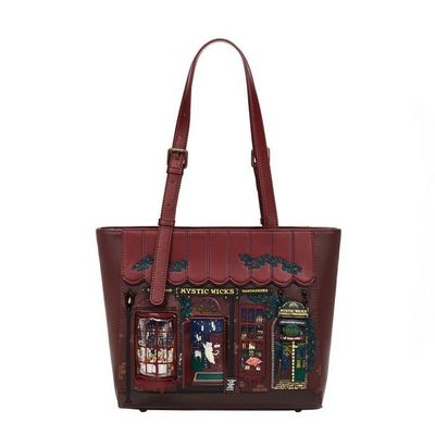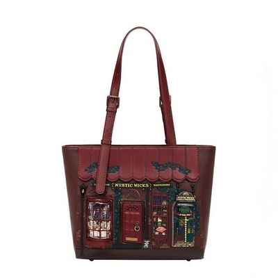 Love spell books and all things mystical? Then the Mystic Wicks Candle and Wandmakers Shopper Bag is your dream come true! This spacious vegan leather bag features exquisite copper hardware and adjustable shoulder straps for optimal comfort. Ideal for work, study, or everyday essentials, it's adorned with printed and appliqué artwork featuring a magical doorway, levitating candles, and a mysterious alleyway. Style, comfort, and sorcery--all in one!
