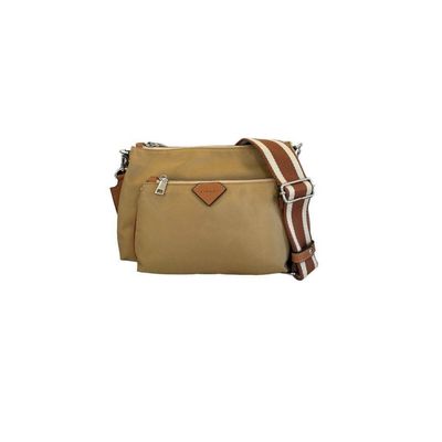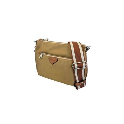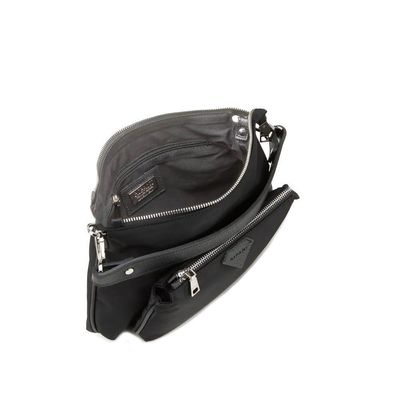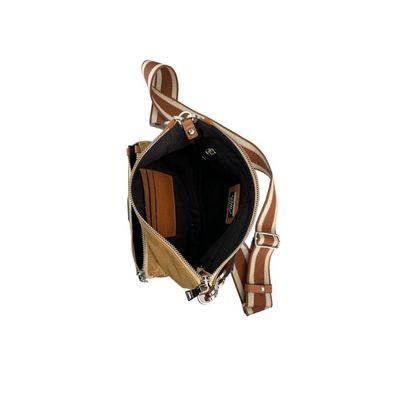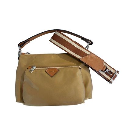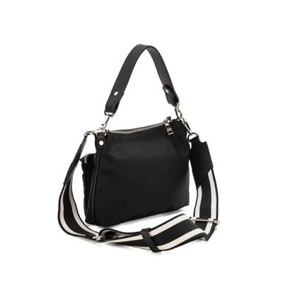 Stylish multi-pocket crossbody in non-leather material with a leather grab handle and black & white webbing shoulder strap.
