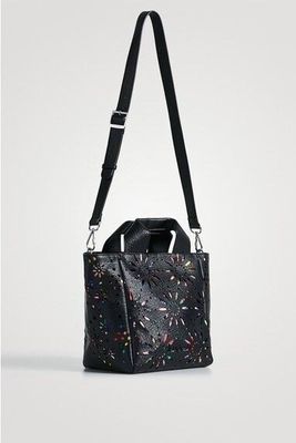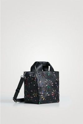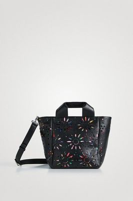 Medium-sized shopper with die-cut in imitation leather in the shape of mandalas and lower floral print. With double handle to carry by hand and shoulder strap.
