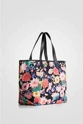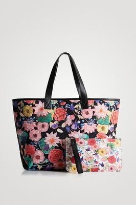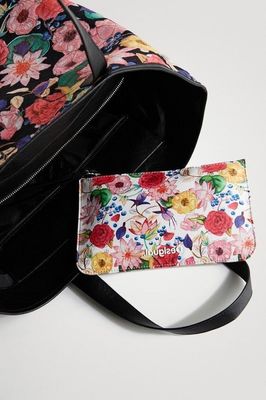 A very soft and light maxi bag with a multicoloured floral print on a black background that can be found on other garments from the collection. It comes with a toiletry bag inside that includes a strap for wearing as a sling.
