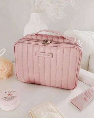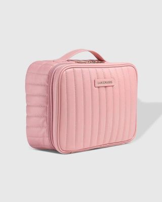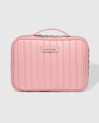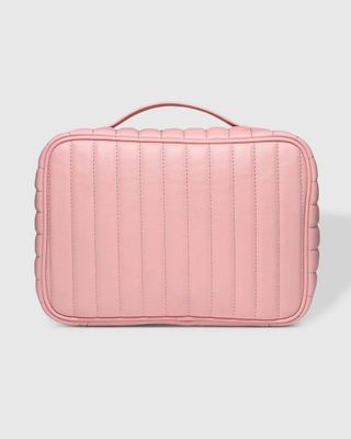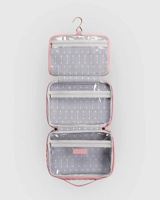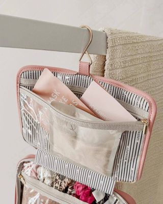 The Louenhide Maggie Pale Pink Cosmetic case is a beautiful quilted large toiletries bag. Designed to be functional and spacious with three clear zipped compartments to store your makeup, skincare, and toiletries all in one. This hanging cosmetic bag is designed with a hook to easily use while travelling. Take with you on weekend adventures or around the world!
