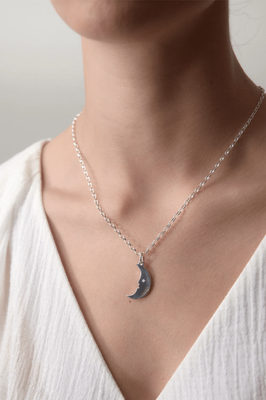 With a twinkle in his eye, an anthropomorphic moon shines like a luminary in the night sky as it hangs from a 45 cm belcher chain to forge Karen Walker's classic Moon Pendant in sterling silver.