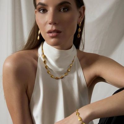 The Francesca Bracelet by Zahar features a refined row of polished teardrop links that wrap elegantly around the wrist. With its smooth, high-shine finish and adjustable fit, it’s a timeless statement piece designed for effortless, everyday styling.