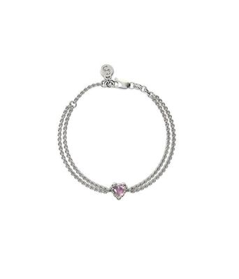 The Love Claw Bracelet by Stolen Girlfriends Club features a heart-cut mystic quartz secured in sterling silver sculptural claw settings. Suspended between double cable chains with lobster clasp closure, the polished finish enhances the stone’s tonal variation.