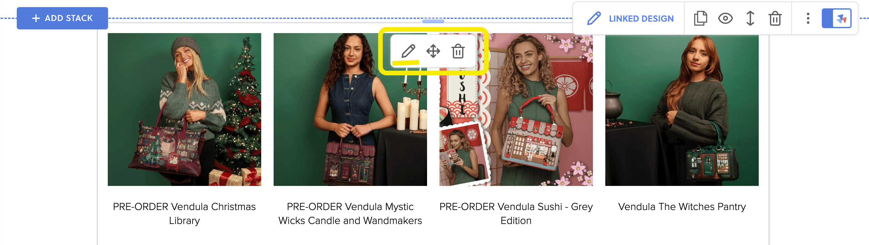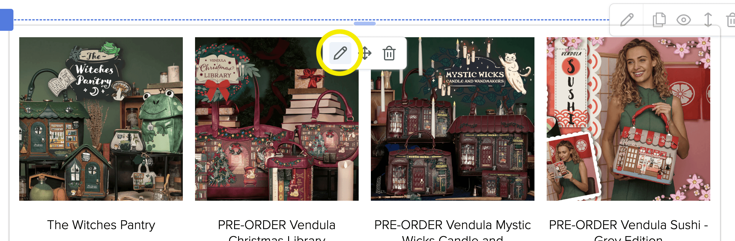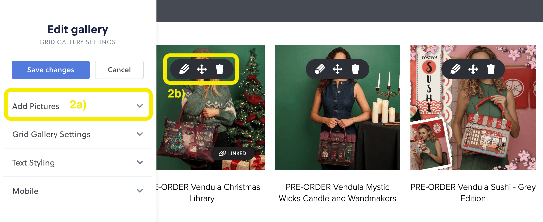 Then, click to edit image within the Grid Gallery (pencil icon).Add Text Title: "Vendula [collection name]" and use 'Secondary text' if delivery dates or pre-order info needed. Please also copy the title and add it in Alt text, for SEO.