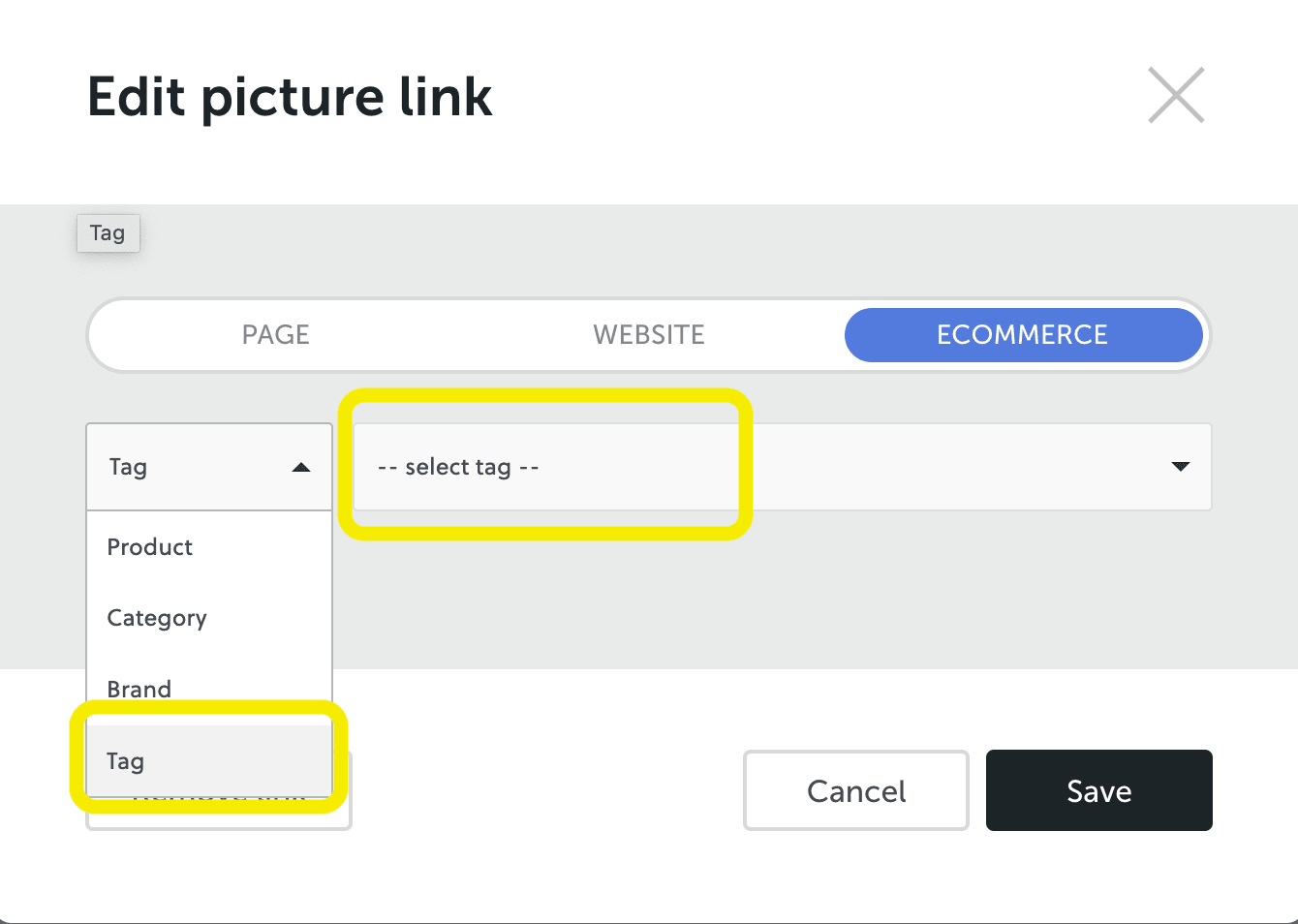 Add a image link (in the photo thumb) - select Ecommerce from the popup and then select the new collection name Tag. You can start typing the name and it'll bring it up. Save.